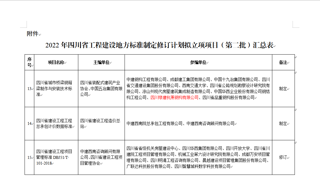“行業(yè)標(biāo)準為旗桿,科研技術(shù)為導(dǎo)向”,2022年8月22日,四川綠建杭蕭鋼構(gòu)有限公司(以下簡稱:綠建杭蕭)參編的《四川省城市橋梁鋼箱梁制作與安裝技術(shù)標(biāo)準》在四川省住建廳官網(wǎng)進行公示。這是繼“中國鋼結(jié)構(gòu)協(xié)會”會員單位、第二批天府綜改企業(yè)之后,同年再次獲得的殊榮。綠建杭蕭在行業(yè)領(lǐng)域標(biāo)準中發(fā)出了自己的聲音!